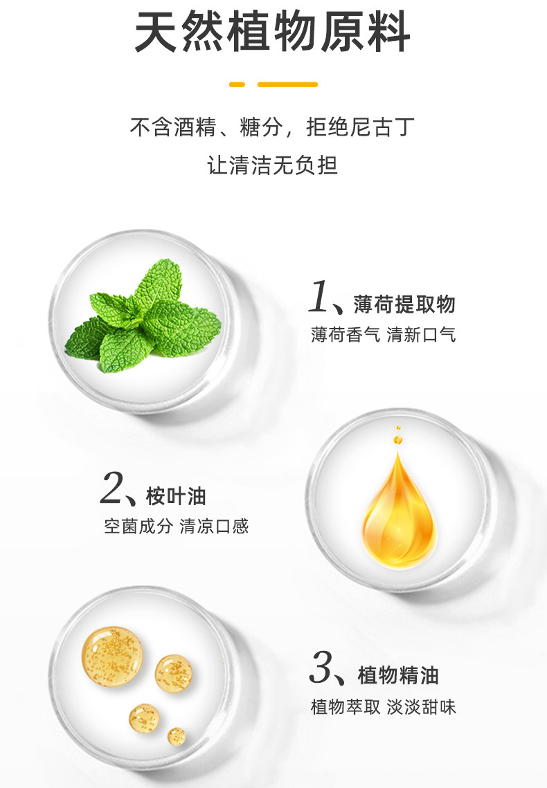 和一般产品“以香掩臭”的方式不同,oxa亲雾雾化口香糖所采用的成分均为天然植物原料,不含酒精、糖分,拒绝尼古丁。从源头杀菌抑菌,调节口腔PH数值,从内而外解决口臭问题,能有效消灭腔99%的细菌。