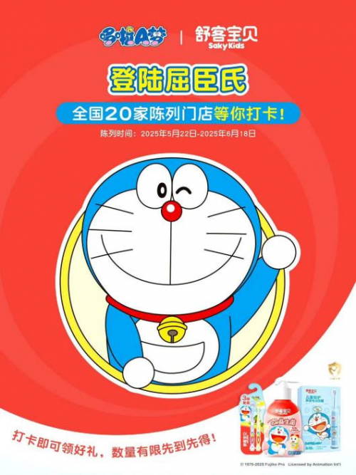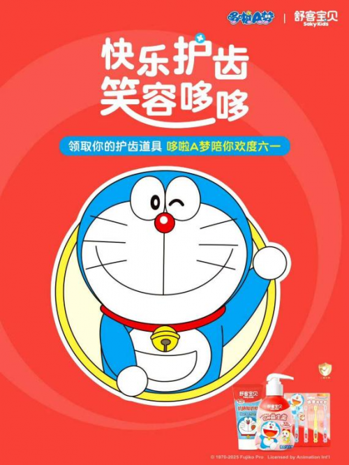 如果说舒客与《藏海传》的合作瞄准的是Z世代的追剧热情,那么舒客宝贝与哆啦A梦的联名则是一场跨代际的情感共鸣。作为全球经典IP,哆啦A梦承载着“80、90后”的童年记忆,同时以“魔法伙伴”形象持续吸引Z世代儿童。舒客宝贝选择与其合作,旨在通过IP的“跨代际情感穿透力”,同时触达家长与儿童两大群体。